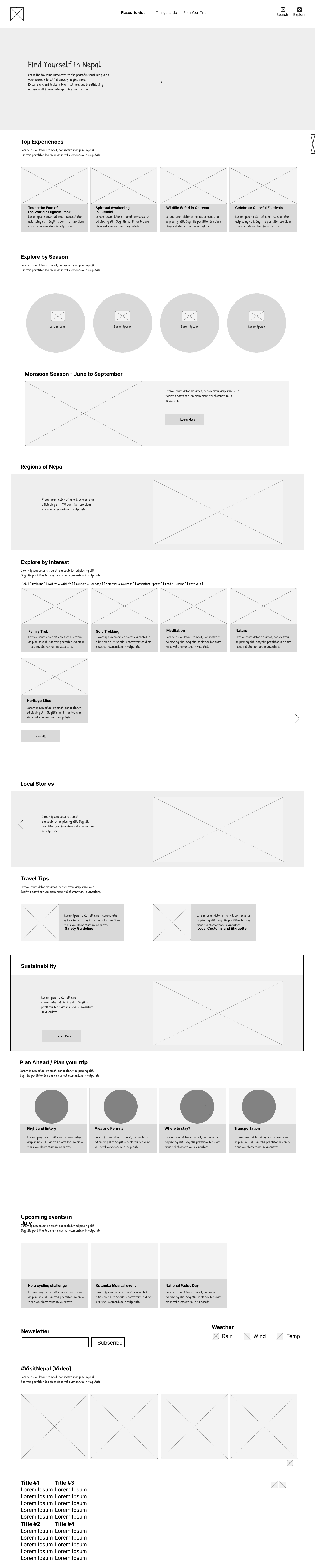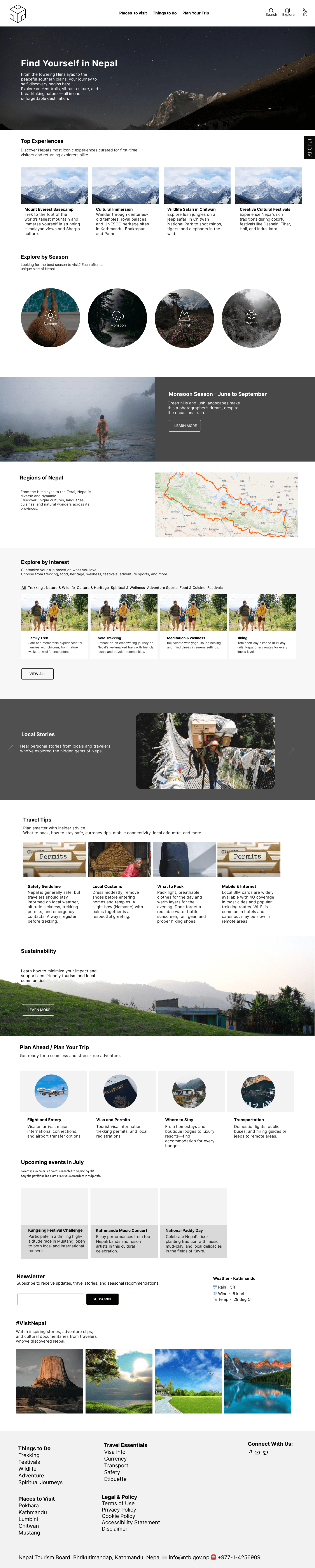 A hero section with breathtaking visuals of Nepal, followed by structured sections: “Top Experiences,” “Explore by Season,” “Explore by Region,” and “Top Experiences.”