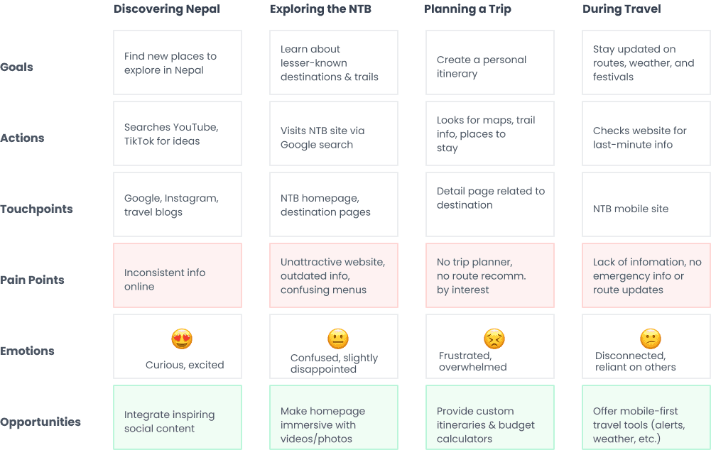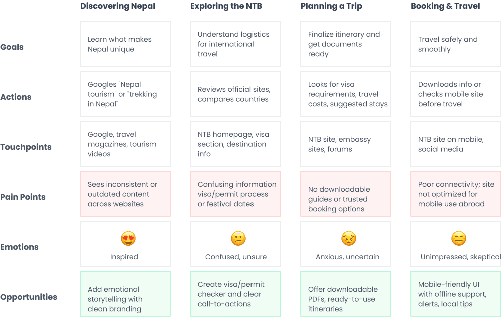 My research showed that travelers were frustrated by information overload and outdated design. To gather deeper insights, I conducted surveys and interviews to understand pain points in planning a trip to Nepal through the current NTB website.